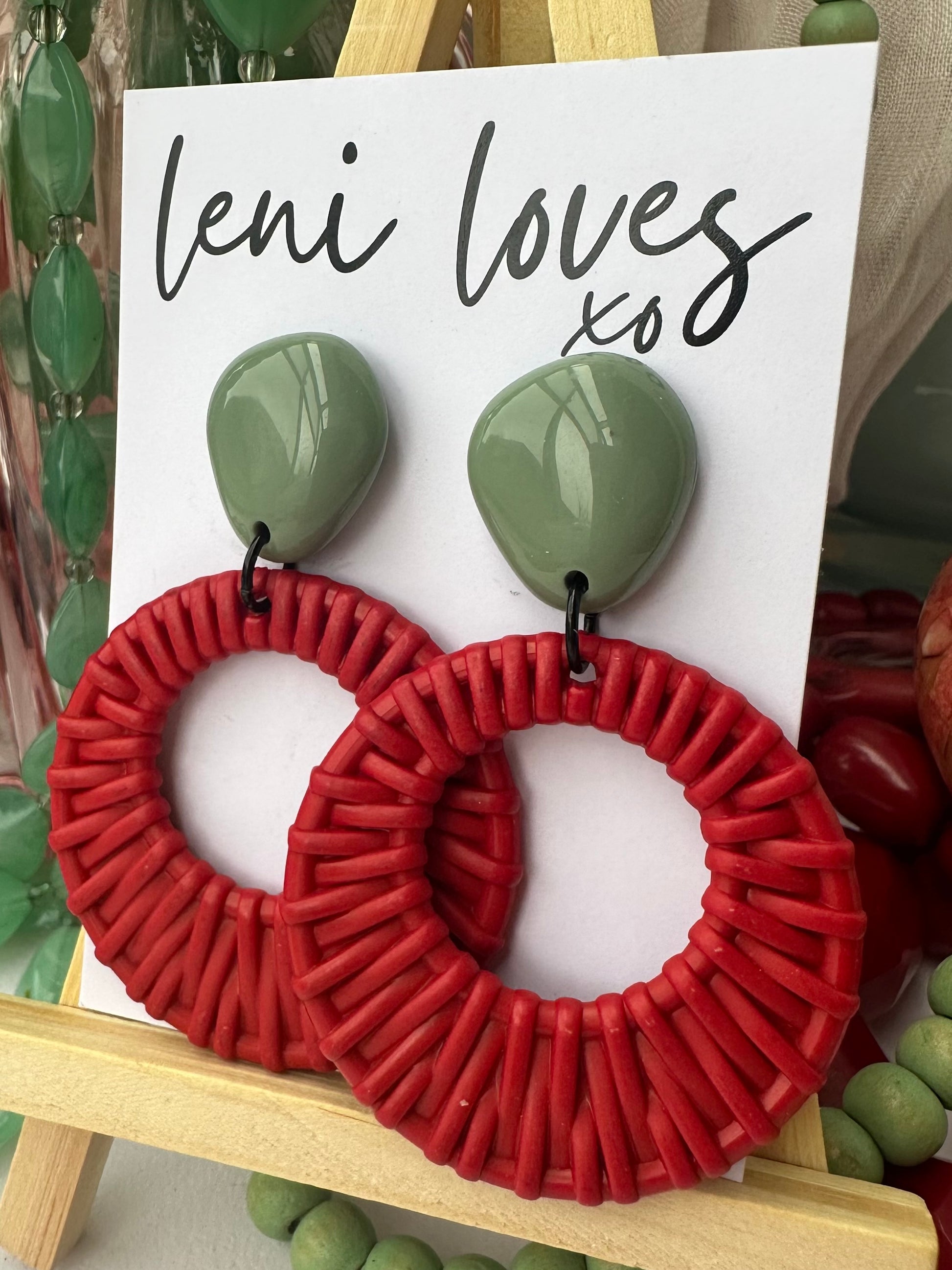 Ada Retro Rattan Dangle Earrings — Olive + Cherry