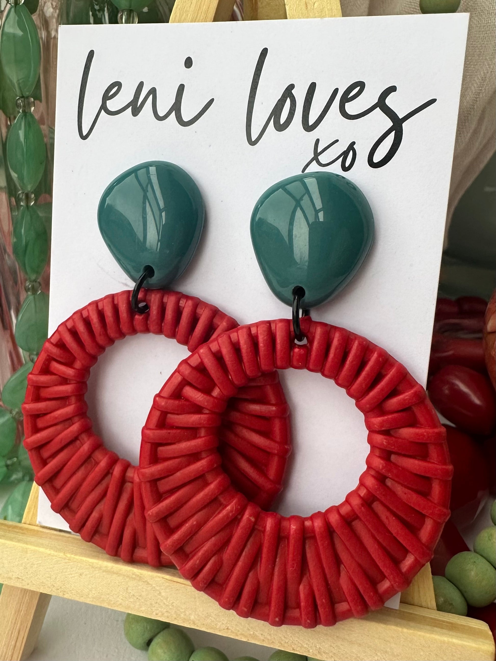 Ada Retro Rattan Dangle Earrings — Teal + Cherry