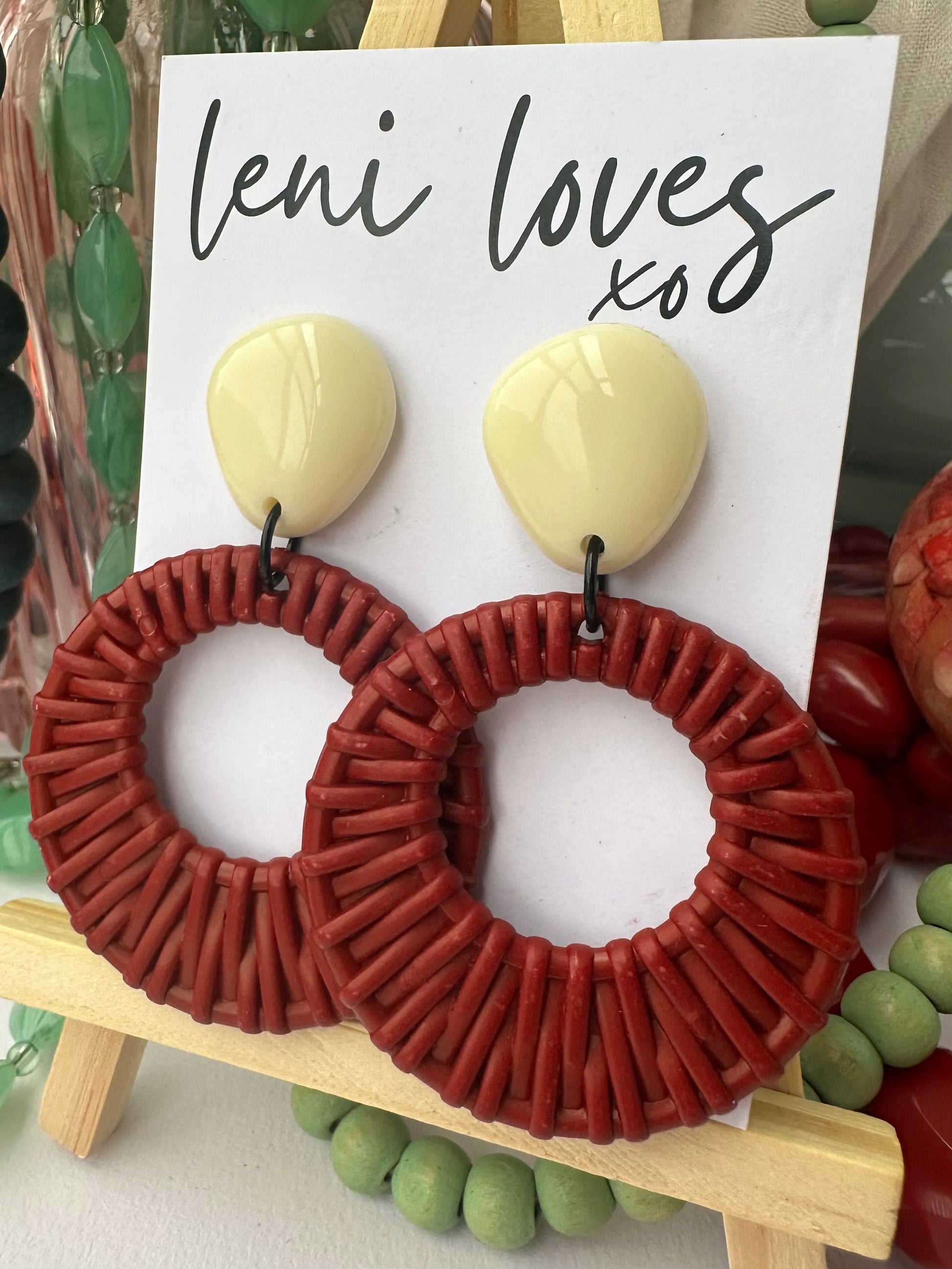 Meet Ada — a vintage-inspired classic with a modern twist. Featuring a bold, glossy stud paired with a retro, rattan-style donut accent in your choice of colour, these handmade dangles are designed to bring playful movement and personality to any outfit.