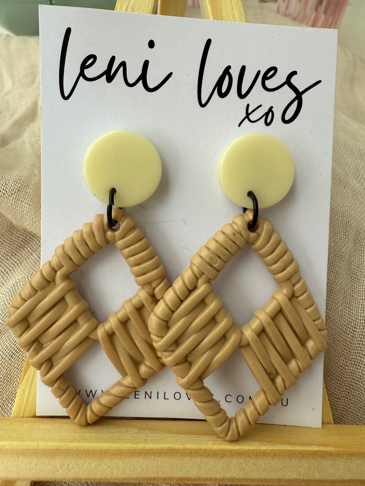 These statement earrings combine a smooth, round stud with a striking diamond-shaped woven drop, creating a look that’s both refined and full of personality.