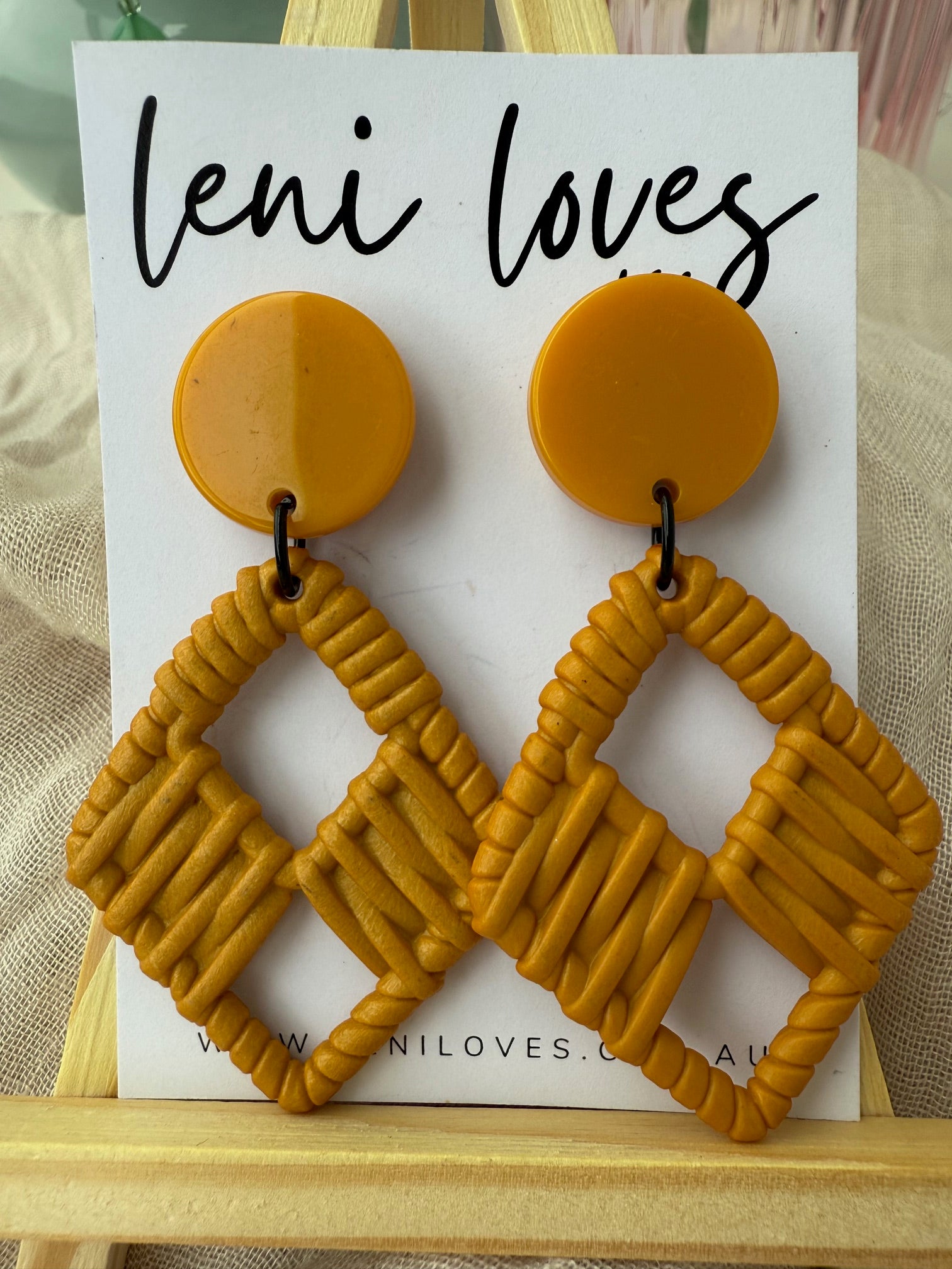 These statement earrings combine a smooth, round stud with a striking diamond-shaped woven drop, creating a look that’s both refined and full of personality.
