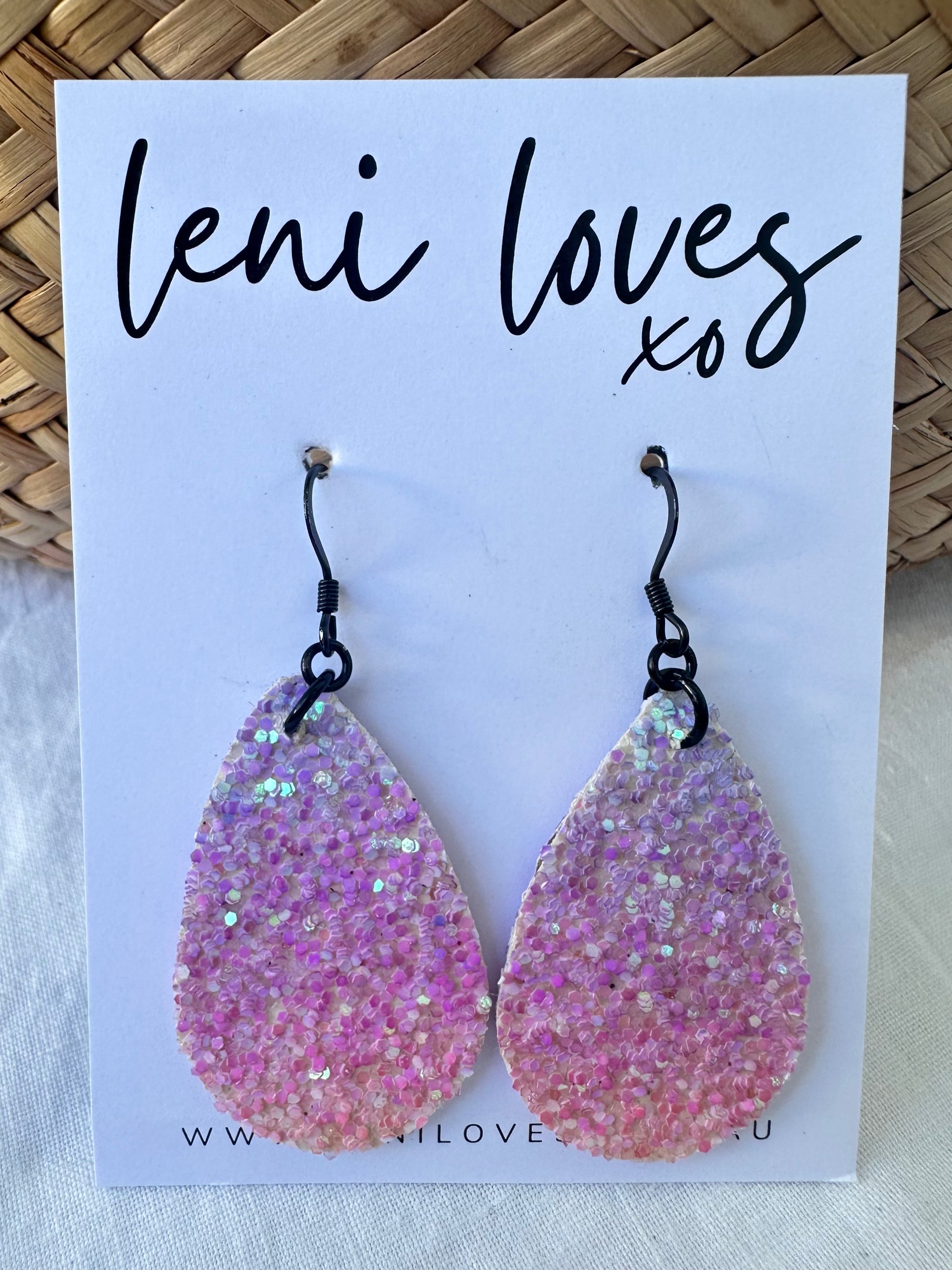 Meet Sophie — radiant, playful, and effortlessly chic. These sparkling leather earrings feature a teardrop shape adorned with iridescent glitter, adding a touch of glam and fun to any outfit. The shimmering finish catches the light beautifully, creating an eye-catching effect that’s perfect for both casual days and glamorous nights.